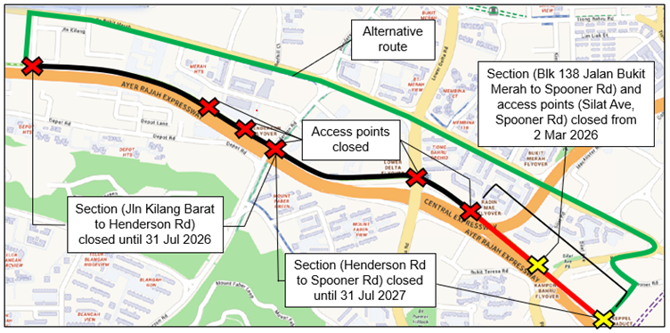 The Rail Corridor (South) is closed from Jalan Kilang Barat to Spooner Road, including the section between Henderson Road, Blk 138 Jalan Bukit Merah and Spooner Road. The affected access points are listed in the map below.